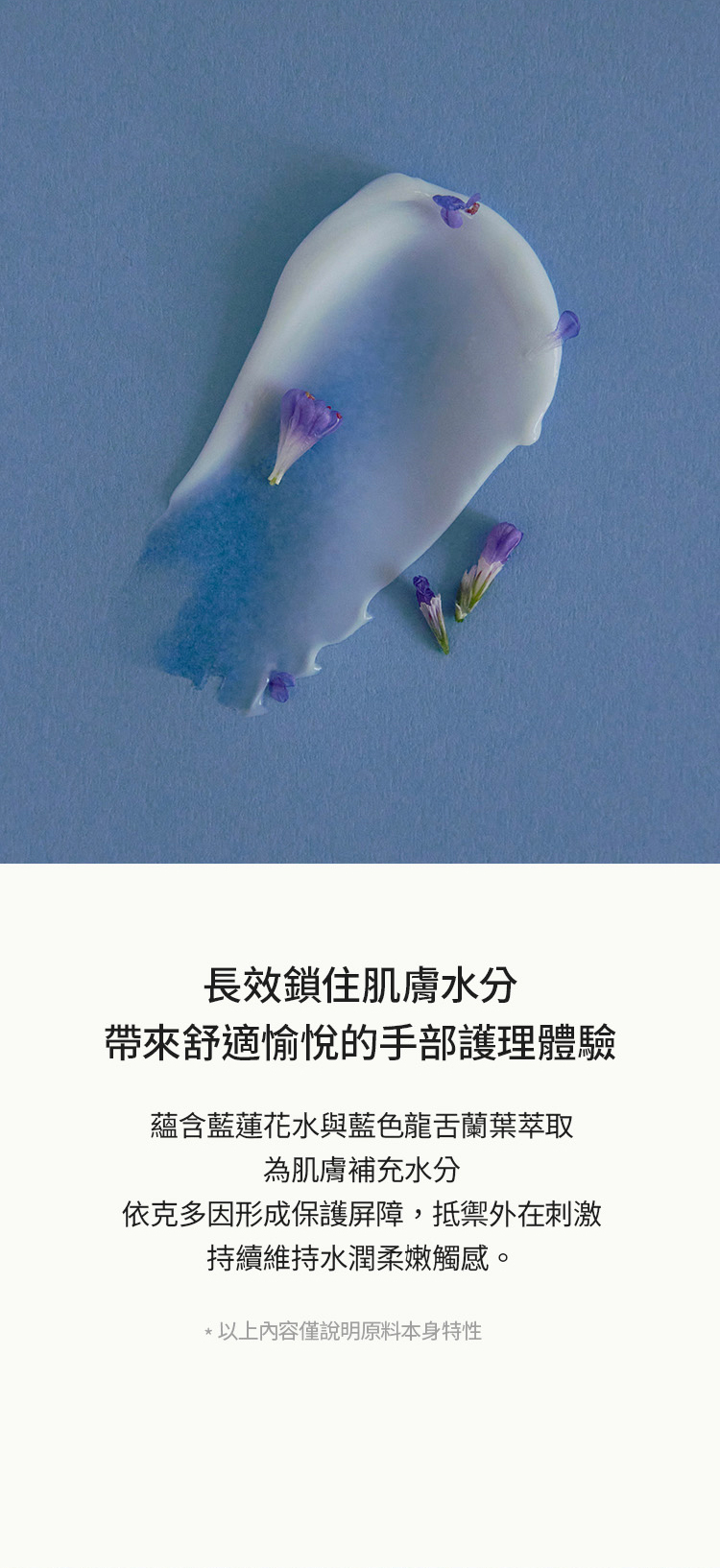 護手霜蘊含藍蓮花水與藍色龍舌蘭葉萃取,為肌膚補充水分